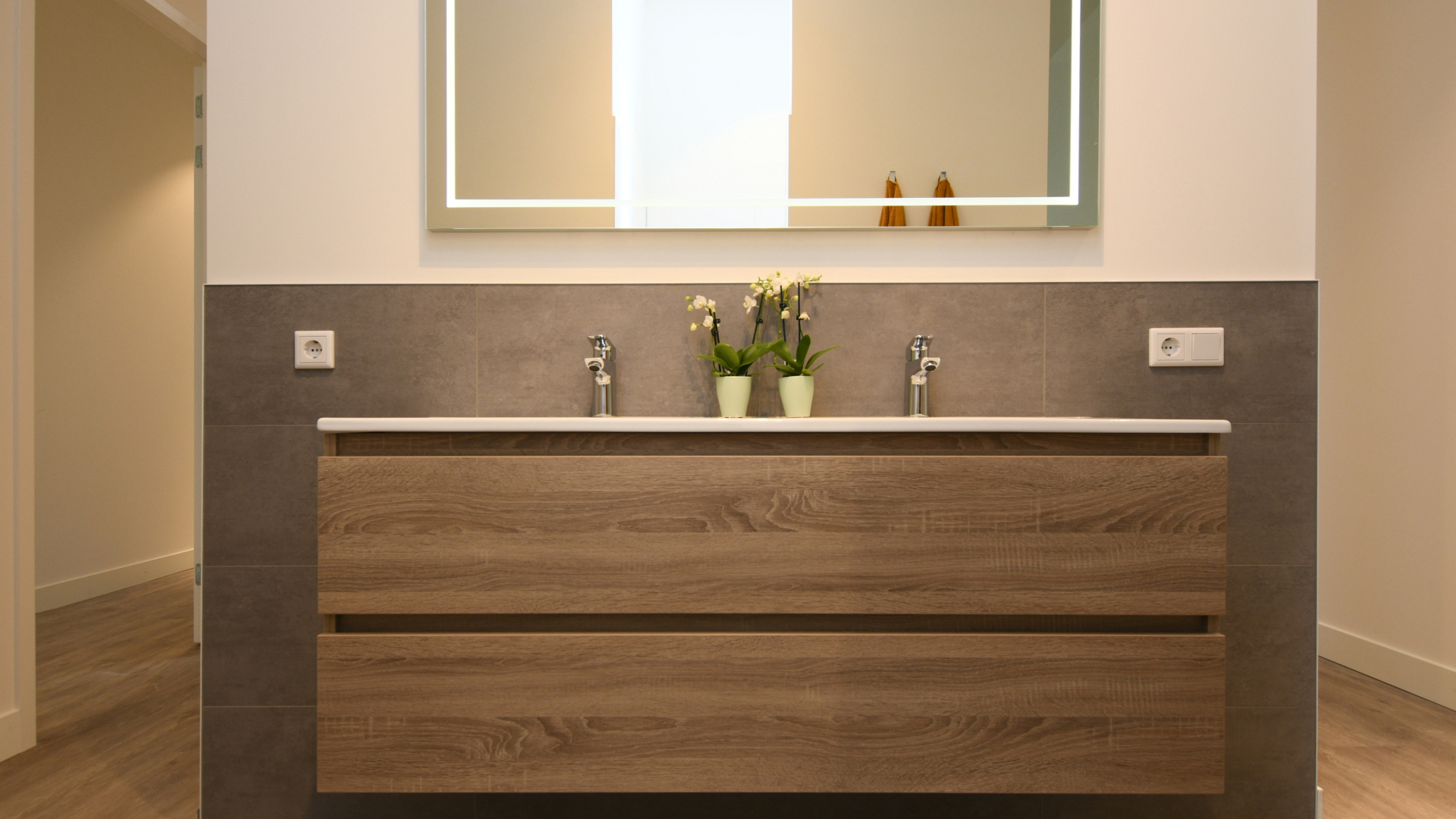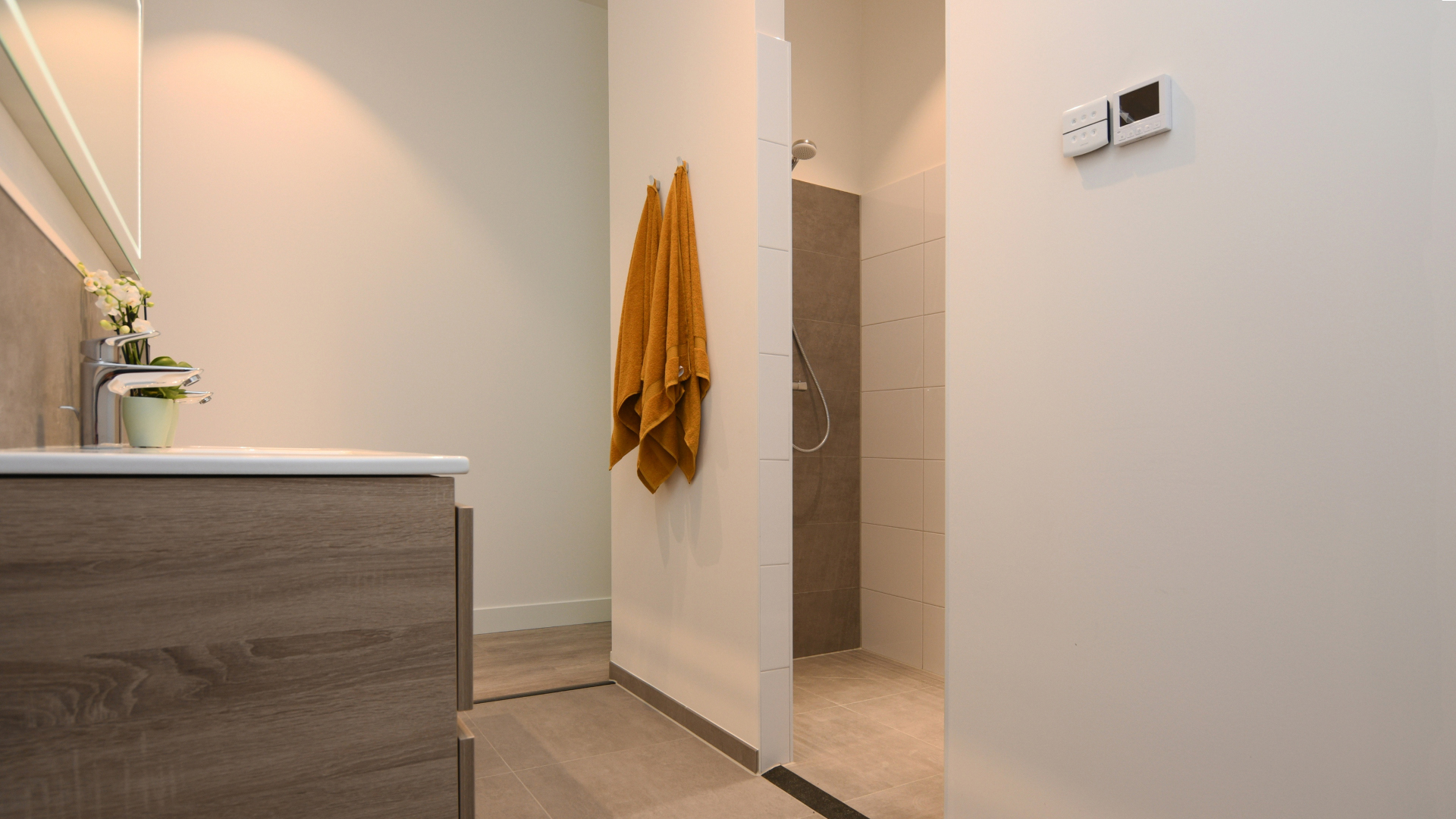 In de badkamer vind je een inloopdouche, dubbele wastafel met spiegel en een wastafelmeubel. Vloerverwarming zorgt voor extra comfort.