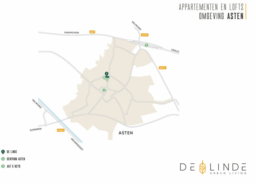Uitvalswegen A67 richting Eindhoven/Venlo en de N279 richting Helmond en Veghel zijn vanuit De Linde goed bereikbaar.